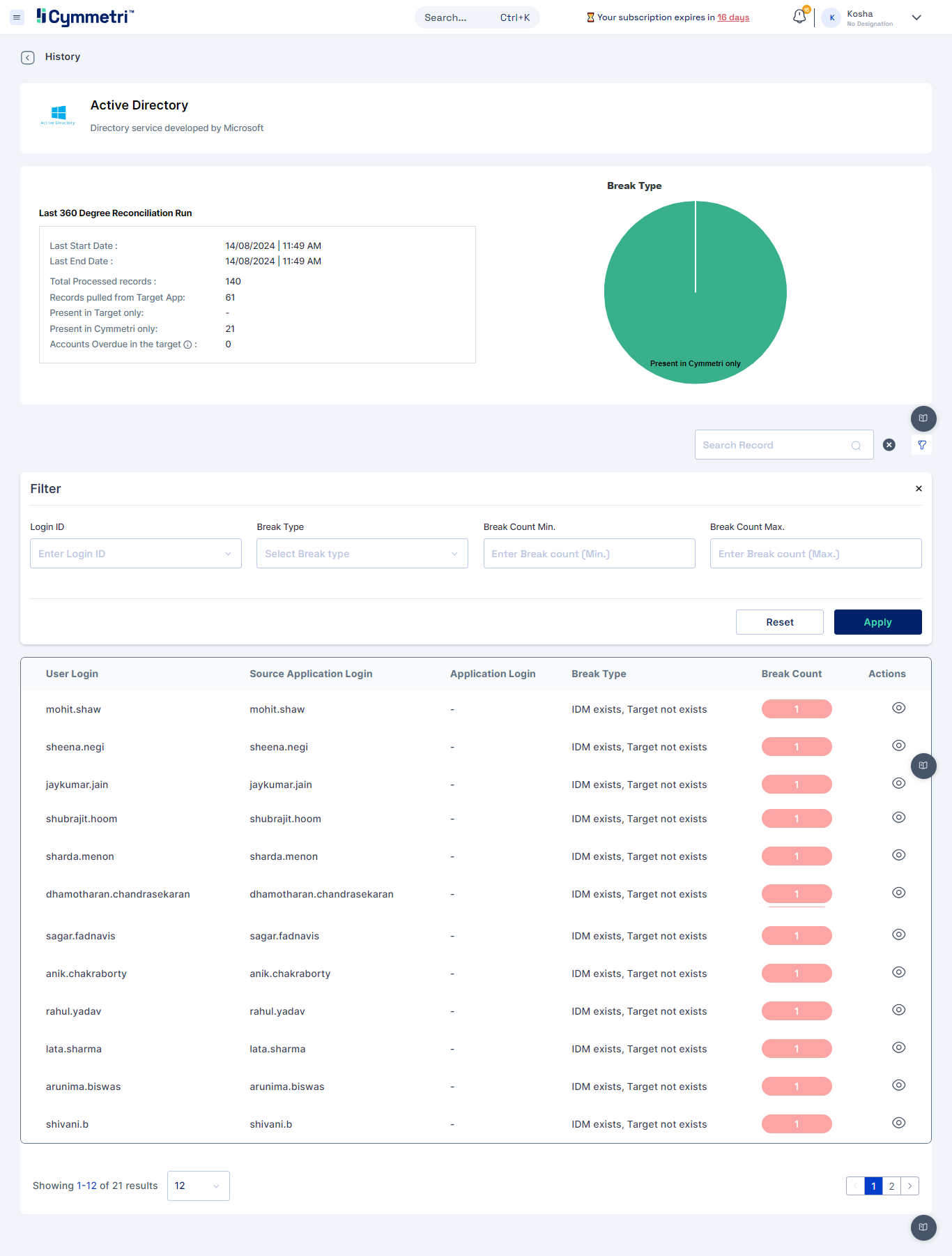 * **Present in Target only**: Number of records that exist in the target system but not in Cymmetri.