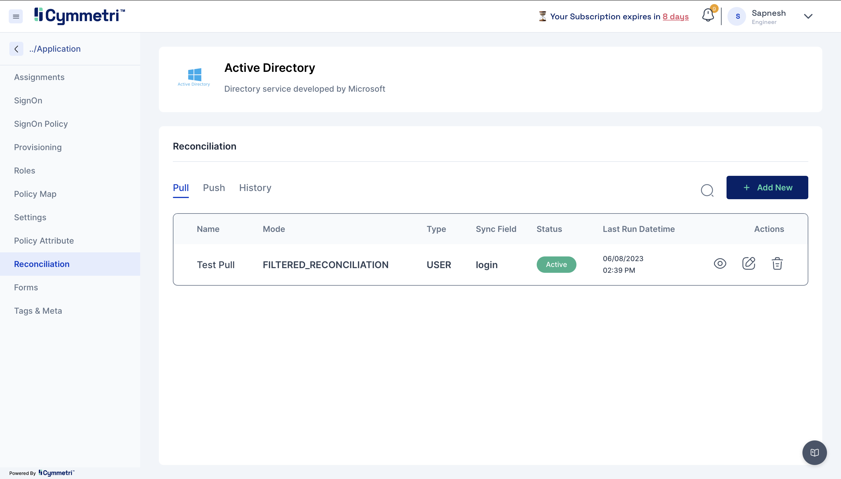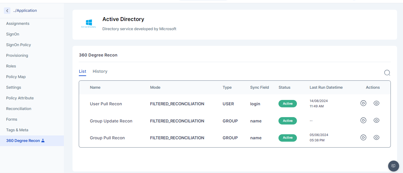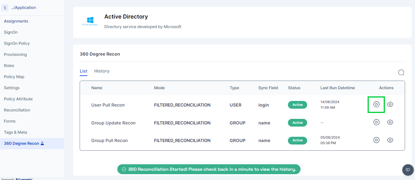 The 360 degree recon can be configured for all the provisioning applications supported by Cymmetri. Here we will be seeing an example of 360 Degree Recon with Active Directory.