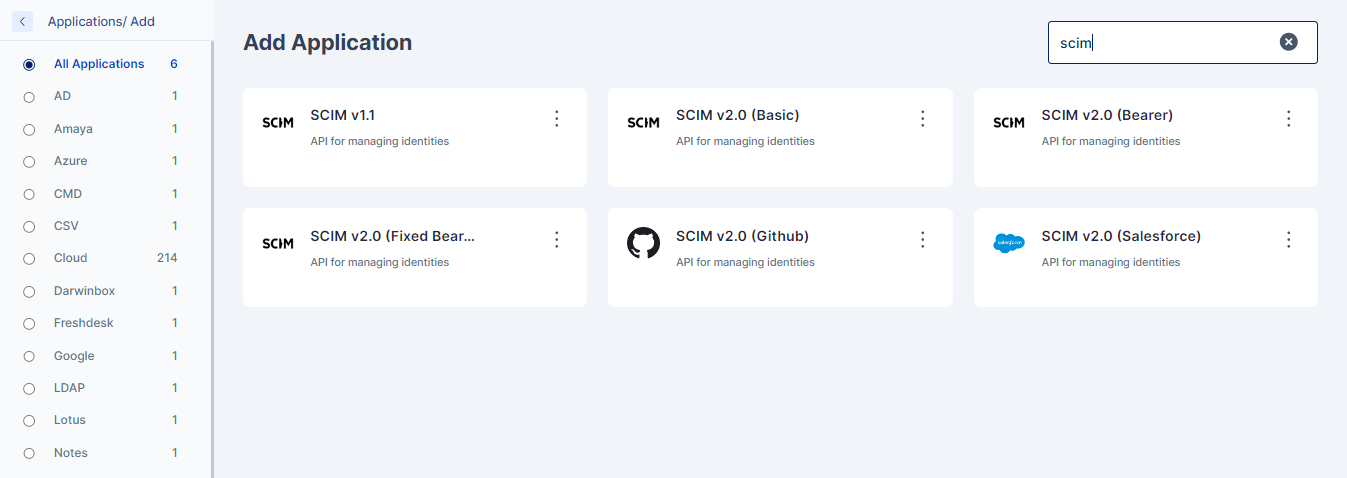 2. In the Add New Application screen, you may search for your desired application (e.g., Active Directory or some authorative source like Darwin Box or Oracle HCM), or your desired connector (e.g., REST) or choose the “Custom” application type from the available application catalogue.