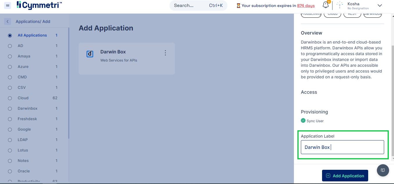 4. Add your custom label (if you wish) in the text box and click on the “Add Application” button.