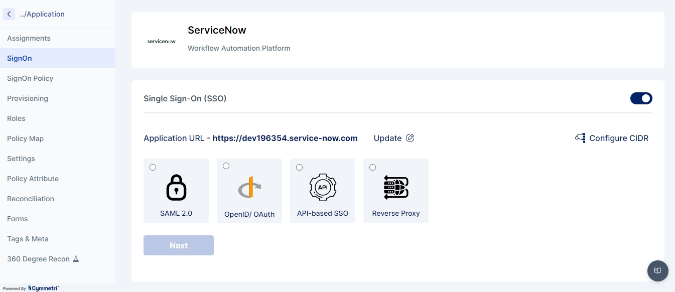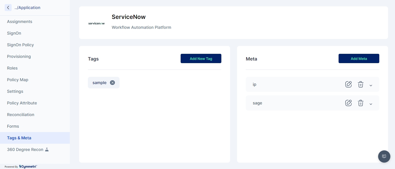 The Application Detail Page provides comprehensive management features for applications within the system. It includes various sub-pages for configuring assignments, sign-on protocols, policies, provisioning settings, roles, and more. Below we outline the functionalities and configurations available on each sub-page.