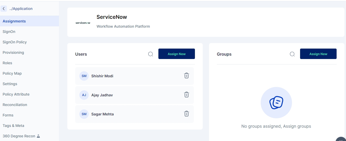 This page allows administrators to assign users and groups to an application. Users or group members can access the application if it is configured for Single Sign-On (SSO) or get provisioned in the application if it is a provisioning application.