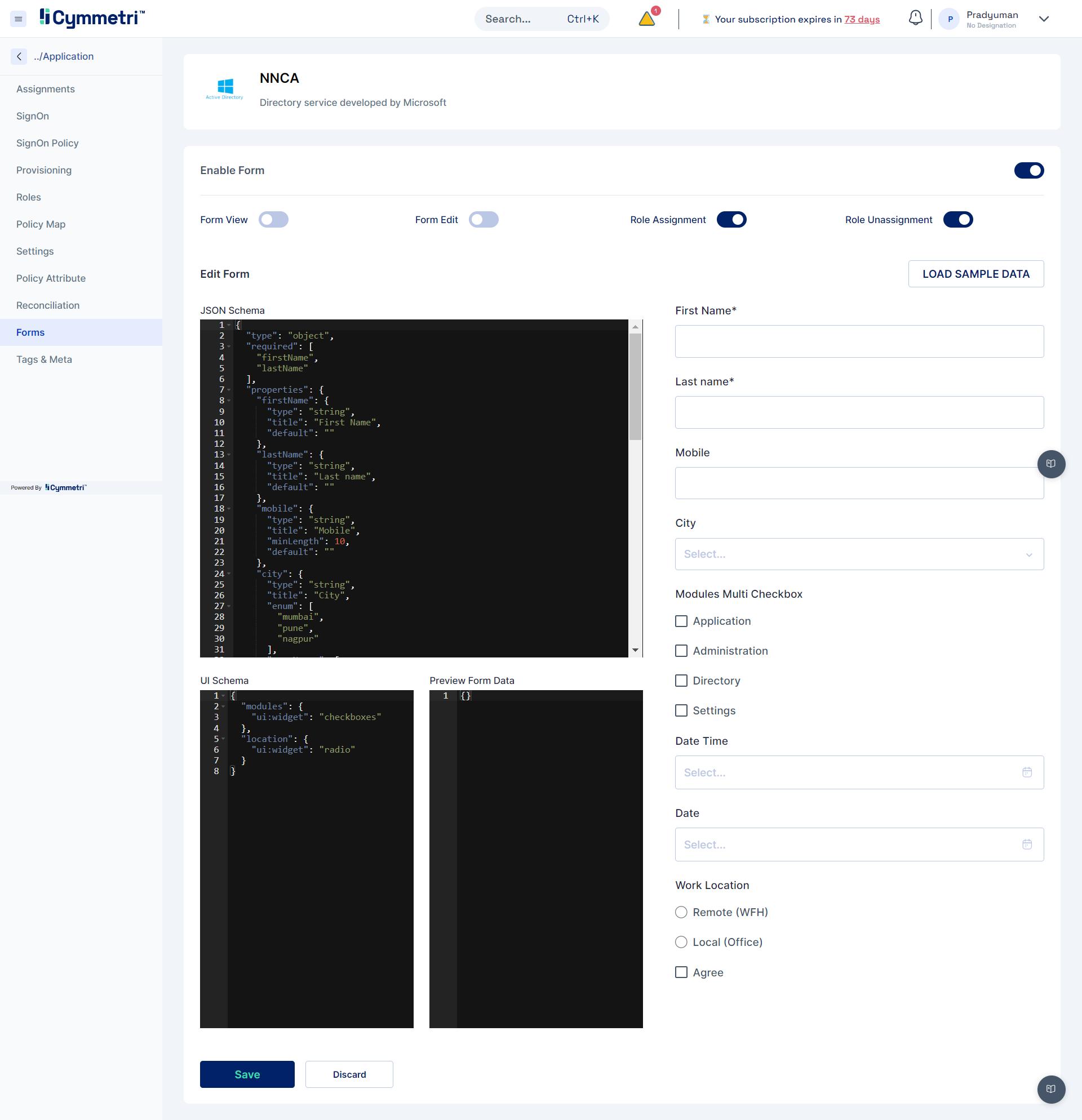 Edit the default form in the JSON Schema section, In the JSON Schema section the administrator can define the form structure with the type of element, and its various properties like type, title, default value etc., a preview of the form is shown on the right hand side.