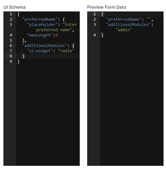 The UI Schema is like a set of json properties that are used to configure how the form should look and behave. It lets you tweak things like the length of a text box or whether a choice should be shown as radio buttons or checkboxes. In the example code, we're using the UI Schema to make the "preferredName" field have a placeholder and also set a maximum length. For "additionalModules," we're using widget property to make it show up as a radio button.