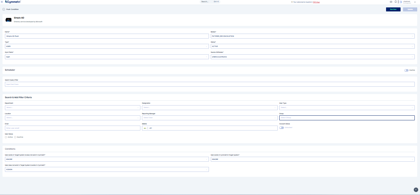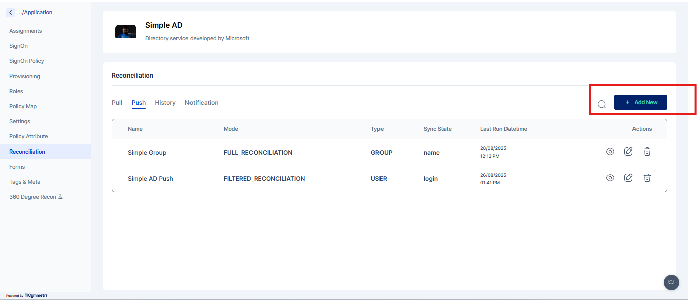 A Push Reconciliation is the process of synchronizing user data from Cymmetri to the AD target system.