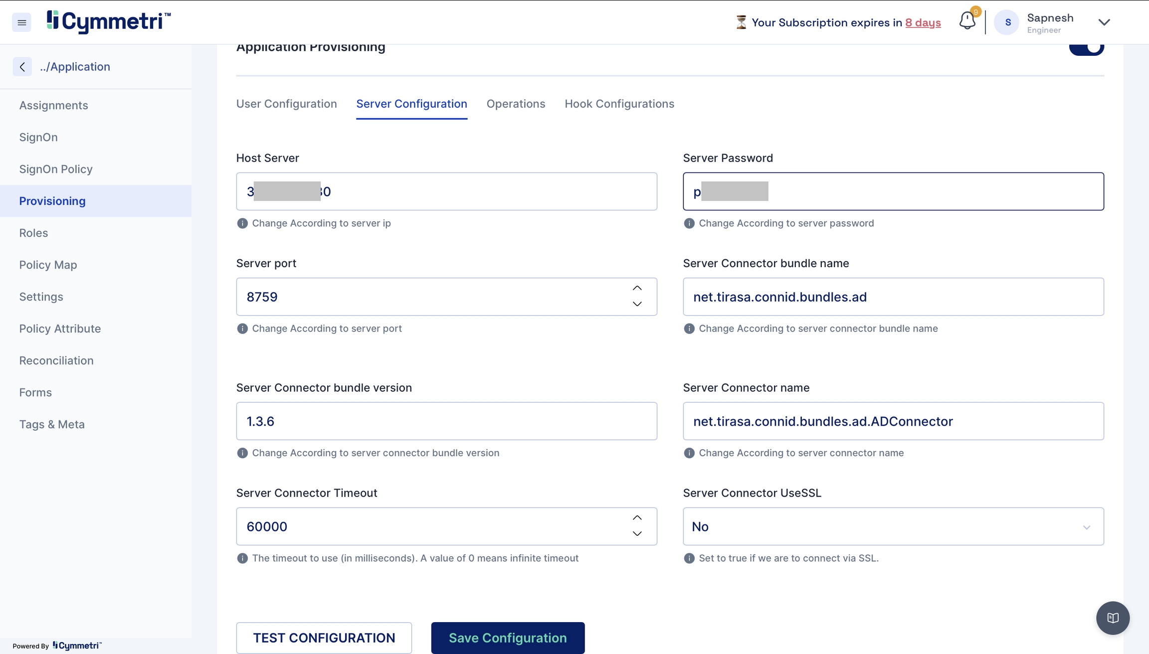 Once you enable the application provisioning, you must take care of two configurations to successfully provision Active Directory data to Cymmetri.