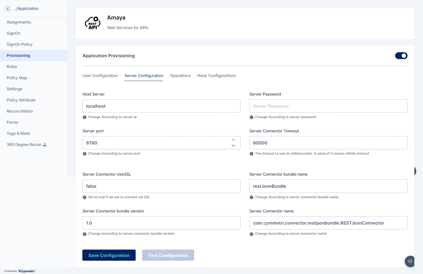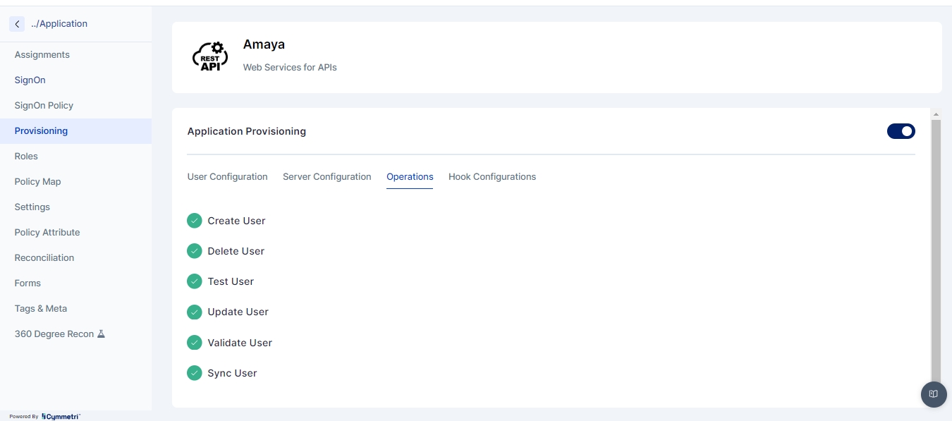 The AMAYA application within Cymmetri is designed to facilitate the provisioning of users and groups to various target systems through a series of configurable operations. This application supports a variety of operations to manage the lifecycle of user identities, including testing a connection to target system, syncing, searching, creating, updating, deleting, and managing roles.
