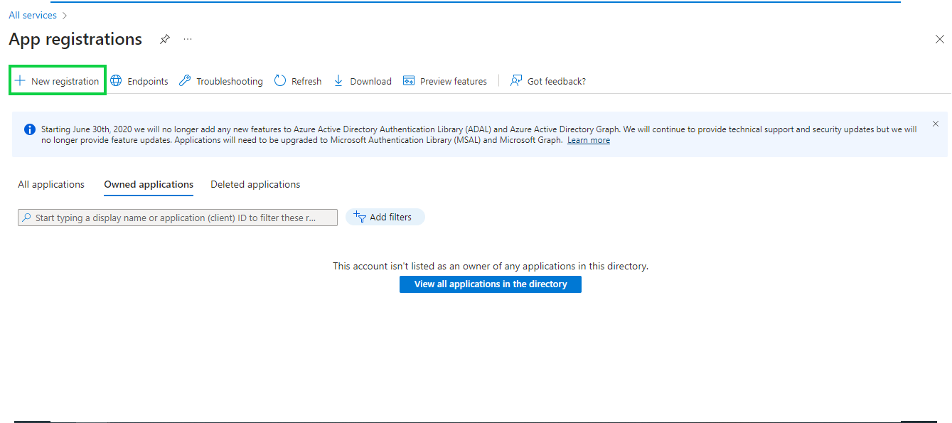 Next click on **New registration** to register a new App. Registering your application establishes a trust relationship between your app and the Microsoft identity platform. The trust is unidirectional: your app trusts the Microsoft identity platform, and not the other way around. Once created, the application object cannot be moved between different tenants.