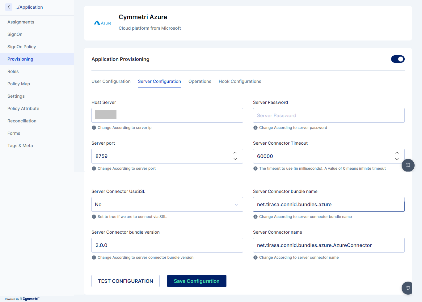 Once the policy map is created next the administrator needs to go to  Provisioning section and then to **Server Configuration** and need to configure the connector server as shown below: