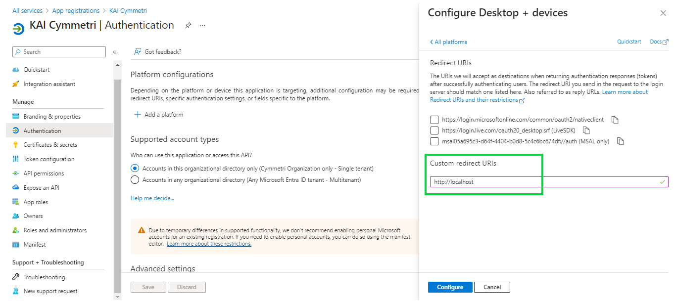 &#x20;Enter a **Custom redirect URIs:**  *<http://localhost>* and click on Configure