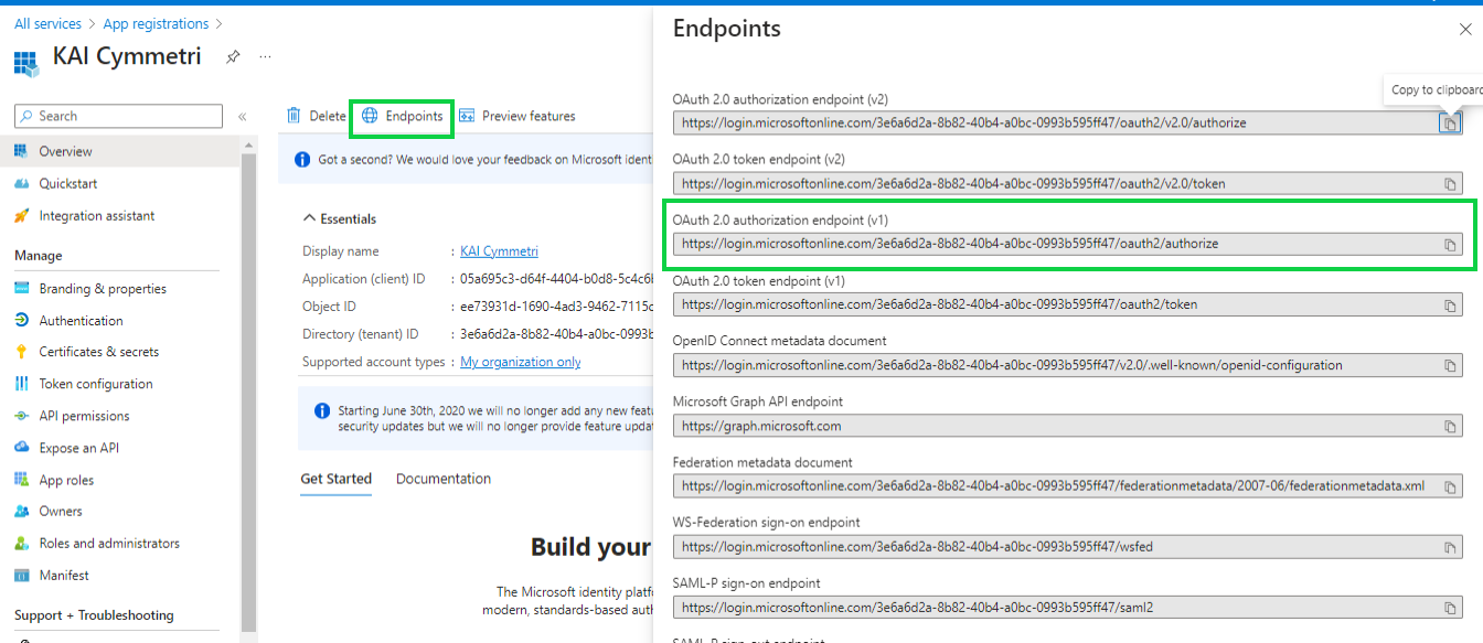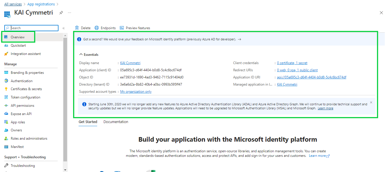 Finally you can see the **Overview** page that contains all the information you need to configure Azure in Cymmetri.