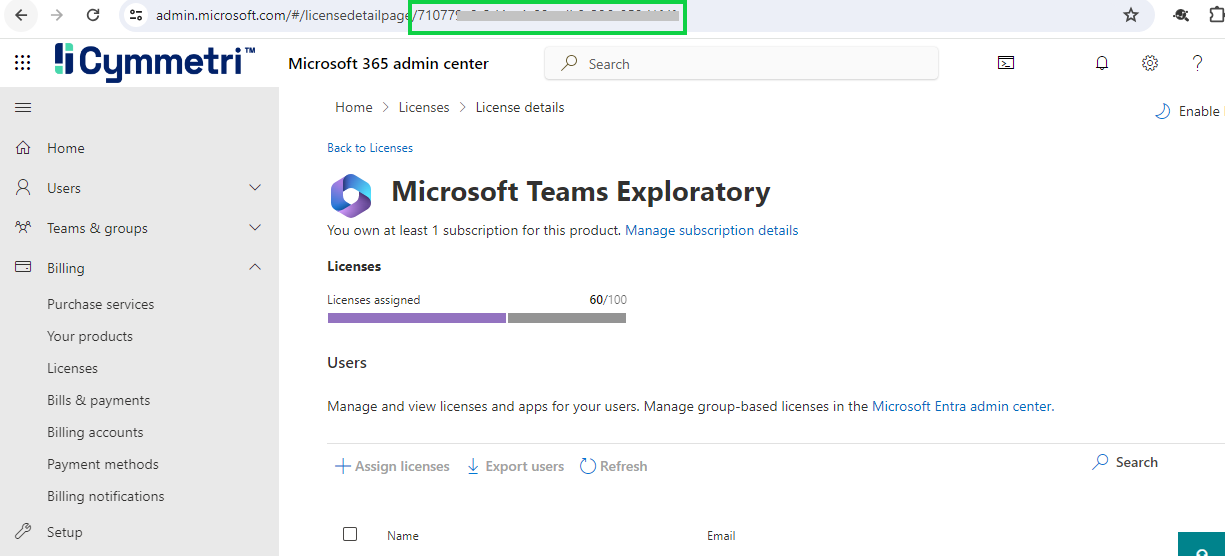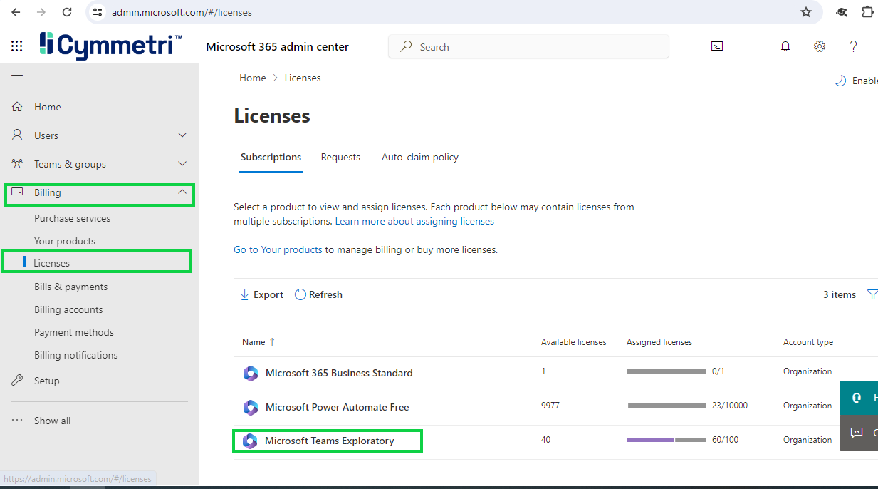 Go to <https://admin.microsoft.com/> and login using the admin credentials. Once logged in go to **Billing->Licenses->Microsoft Teams Exploratory**