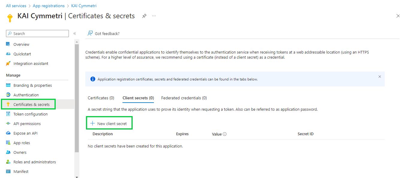 Next go to **Certificates and secrets** menu and create a new client secret: