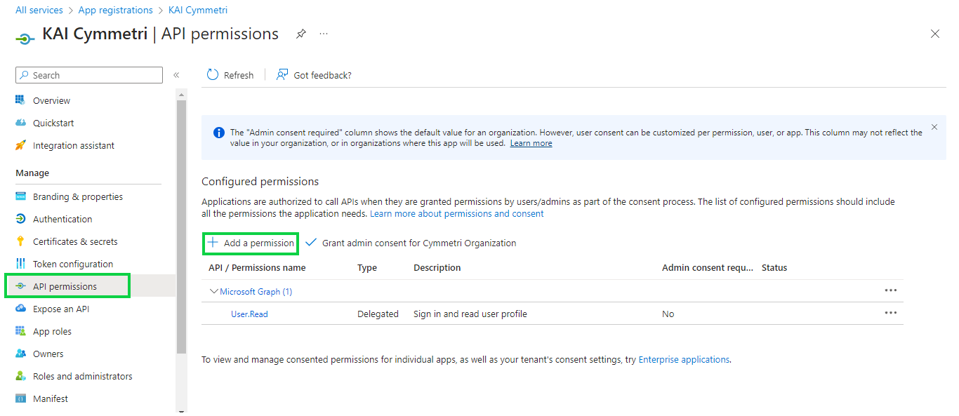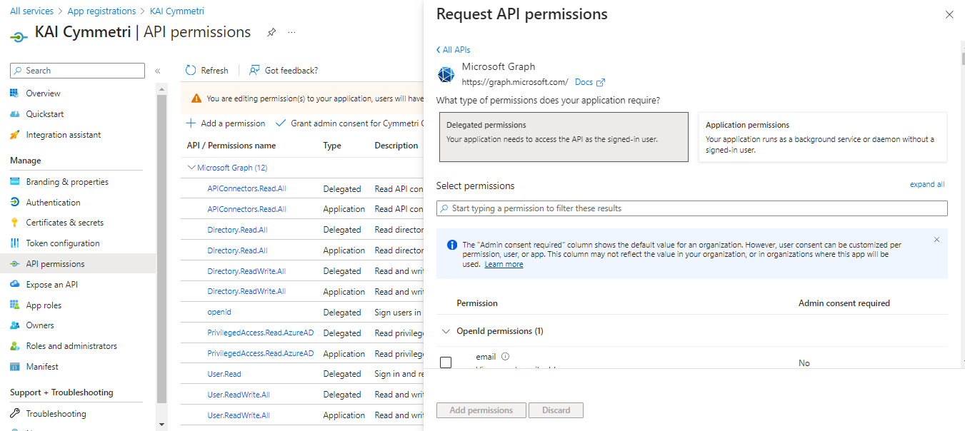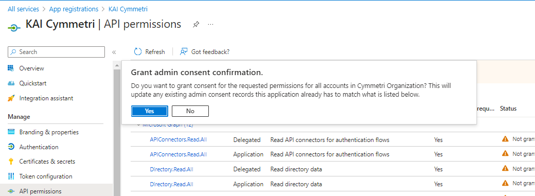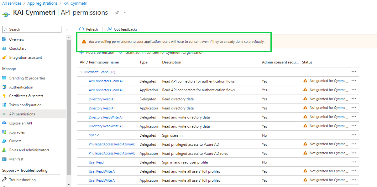 Once all the permissions are added a warning is shown: <mark style="color:red;">"You are editing permission(s) to your application, users will have to consent even if they’ve already done so previously."</mark> The administrator needs to click on the "Grant admin consent for Cymmetri Organization" link