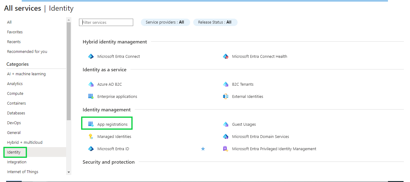 In the next screen click on **Identity** -> **App registrations** inside the **Identity management** section