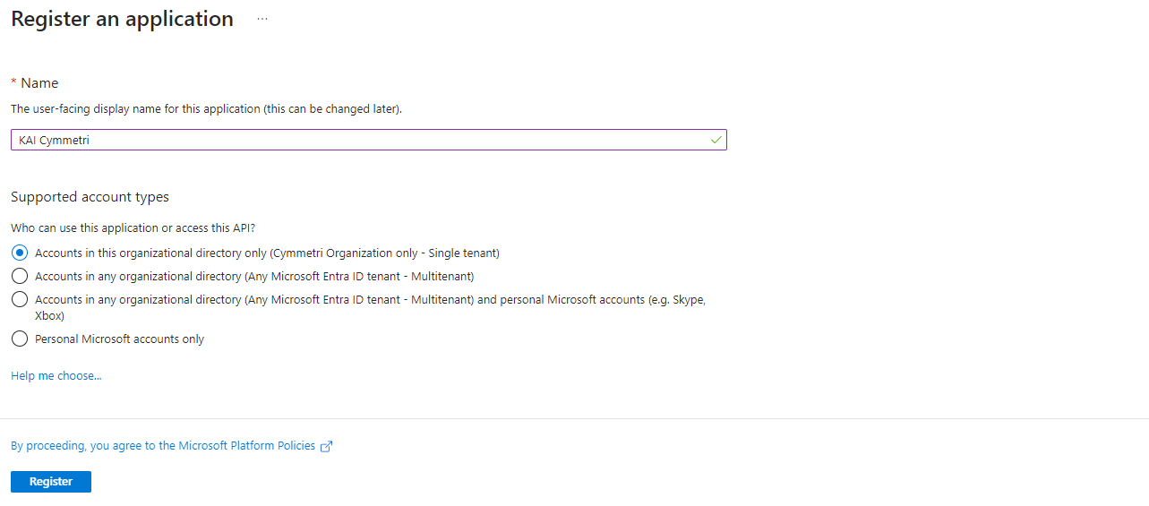 Next enter the **Application Name** and select the Supported account types to organizational directory only : **Accounts in this organizational directory only (Cymmetri Organization only - Single tenant)** and then click on **Register**