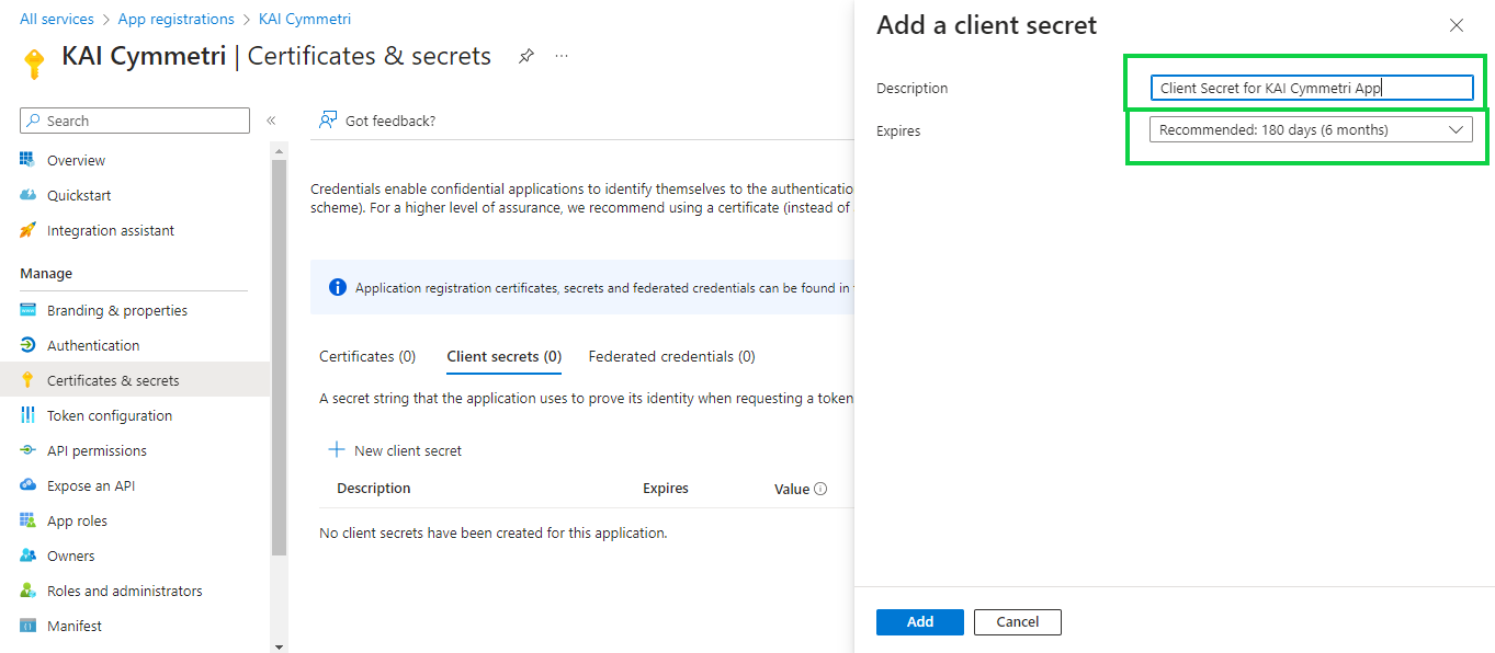 Next enter a **Description** for the and select the duration after which the secret would **Expire** -Recommended is 180 days (6 months) but can be changed as per the need. Once both the details are entered click on **Add** button
