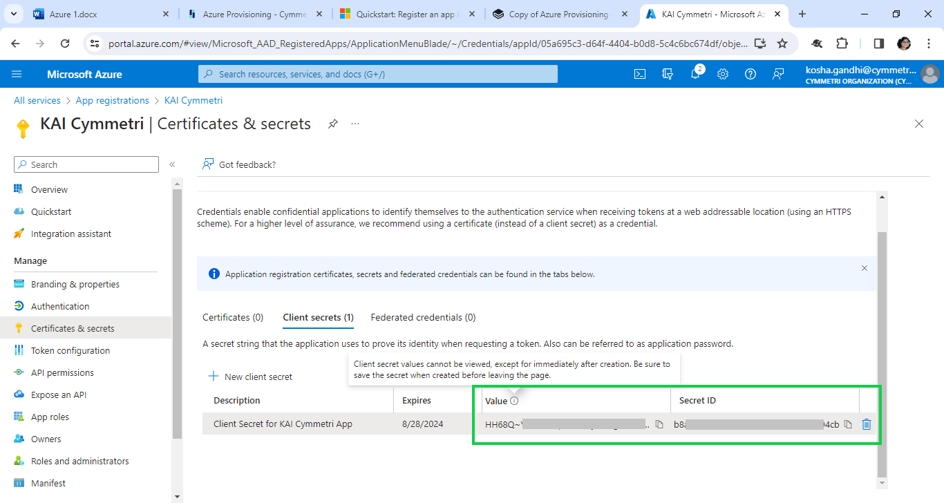 Next copy and save the Client Secret ID and Client Secret Value in a safe and accessible place. Client secret values cannot be viewed, except for immediately after creation. Be sure to save the secret when created before leaving the page.