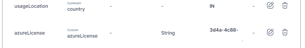 <table><thead><tr><th width="202">Application Field</th><th width="143">Field</th><th width="134">User Principal</th><th width="124">Create Only</th><th>Update Only</th></tr></thead><tbody><tr><td>displayName</td><td>displayName</td><td>-</td><td>True</td><td>True</td></tr><tr><td>__NAME__</td><td>login</td><td>-</td><td>True</td><td>True</td></tr><tr><td>__PASSWORD__</td><td>password</td><td>-</td><td>True</td><td>True</td></tr><tr><td>mailNickname</td><td>mailNickName</td><td>-</td><td>True</td><td>True</td></tr><tr><td>userPrincipalName</td><td>login</td><td>True</td><td>True</td><td>True</td></tr><tr><td>givenName</td><td>firstName</td><td>-</td><td>True</td><td>True</td></tr><tr><td>surname</td><td>lastName</td><td>-</td><td>True</td><td>True</td></tr><tr><td>mail</td><td>email</td><td>-</td><td>True</td><td>True</td></tr><tr><td>usageLocation</td><td>country</td><td></td><td>True</td><td>True</td></tr><tr><td>azureLicense</td><td>azureLicense</td><td>&#x3C;actual license key></td><td>True</td><td>True</td></tr></tbody></table>