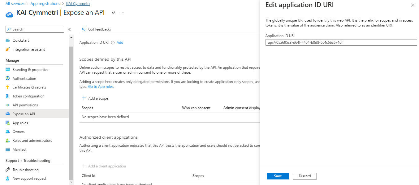 Next click on **Expose an API** and then click on **Add** to add an **Application ID URI**: The Application ID URI, also called identifier URI, is a globally unique URI used to identify the web API. This URI is the prefix for scopes in the Oauth protocol. You can either use the default value in the form of api://, or specify a more readable URI.