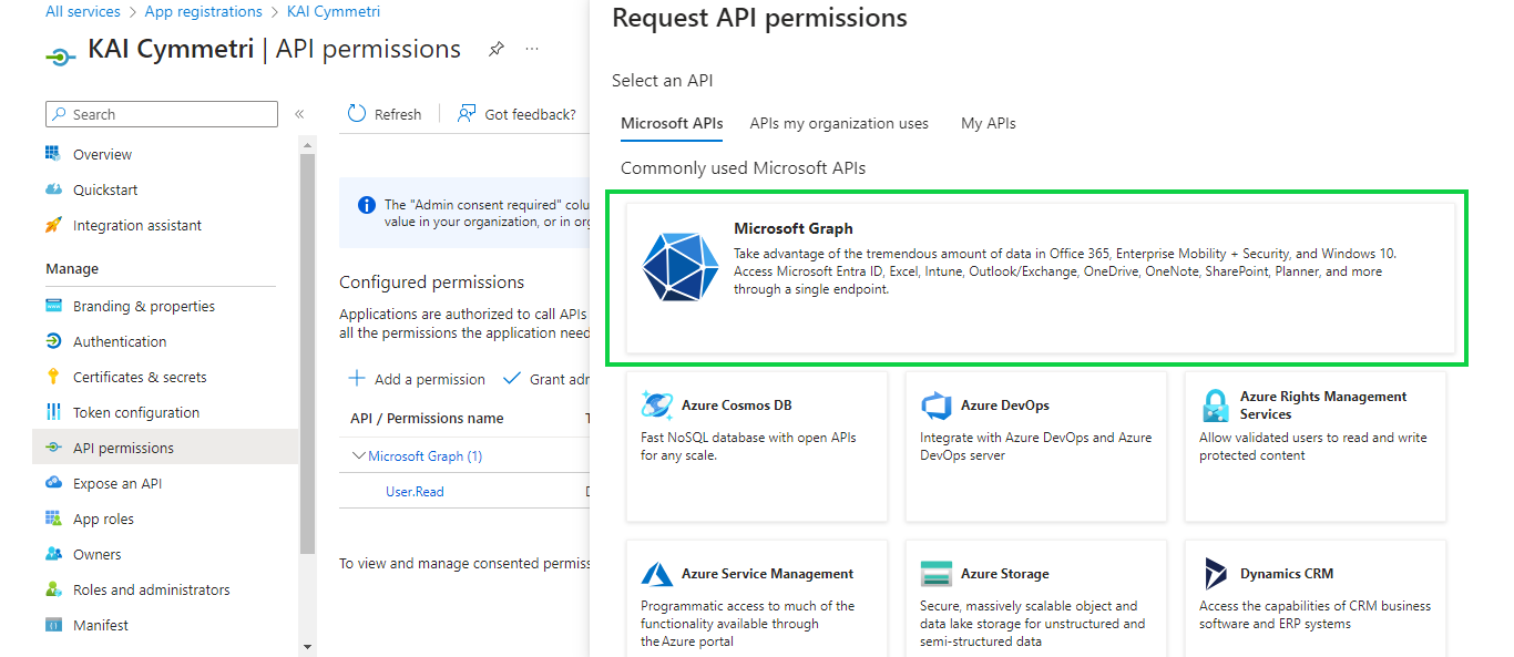 Once the client secret details are stored next click on **API permissions** menu and then + **Add a permission**
