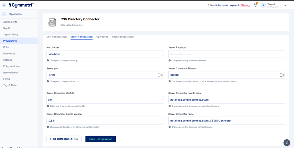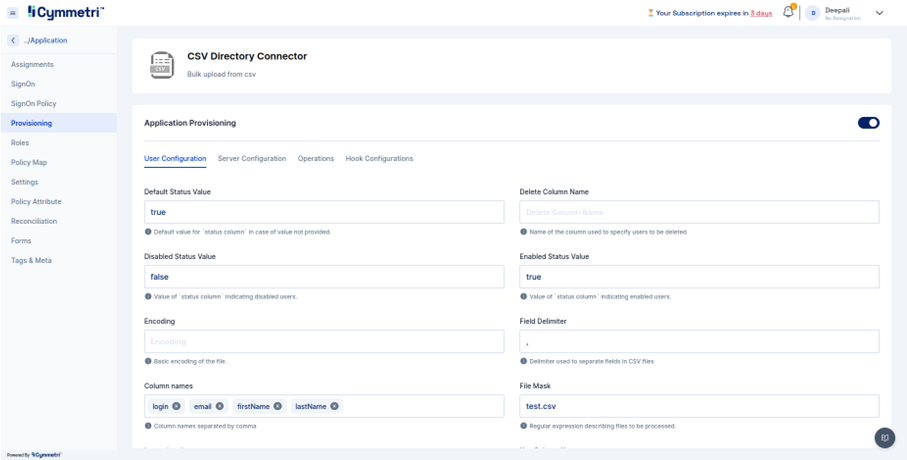 1. After Getting application from Cymmetri master activate provisioning of selected application i.e. CSV Directory.