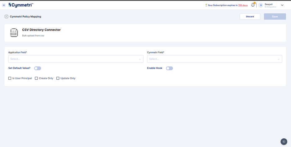 Add the relevant field and map it to the appropriate Cymmetri Field and save. Similarly, add all the required fields and this completes the mapping activity before setting up the [reconciliation ](https://help.cymmetri.io/lifecycle-management/application-management/reconciliation-how-to)task.