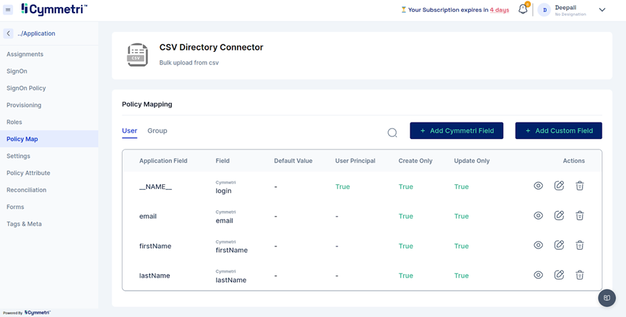 Go to Policy Map and for user Policy Map click on Add Cymmetri Field.