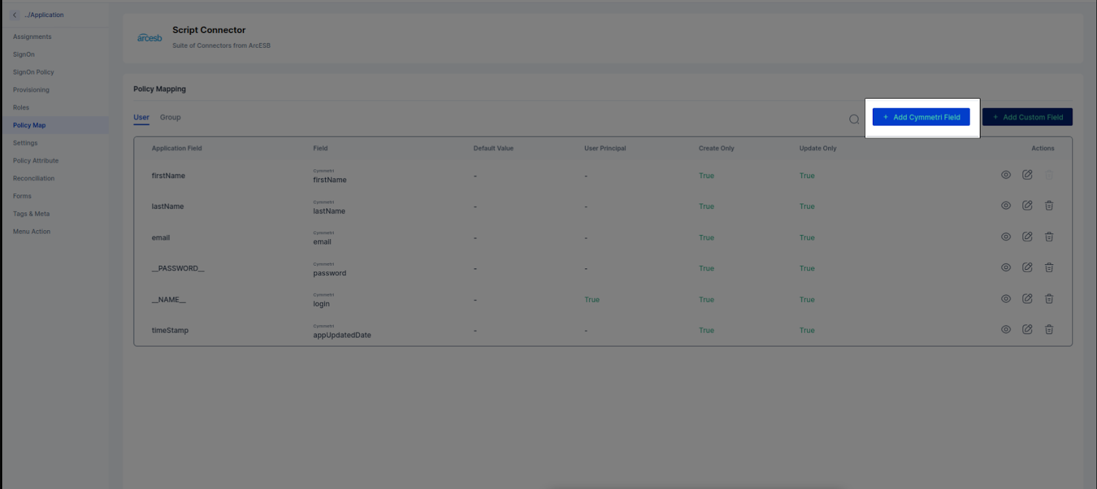 Policy Map :- There is default policy map present in cymmetri master application which provides basic mapping of ScriptOn (Database) application with cymmetri. To configure these mapping we need to activate it as in create only and update only flags need to be true as per requirement.
