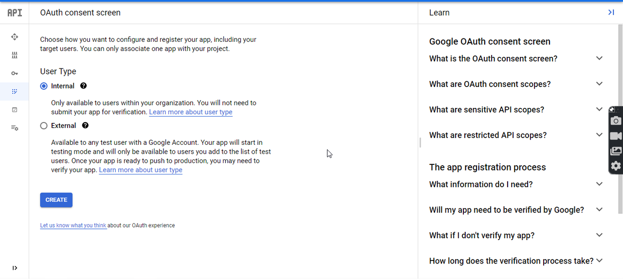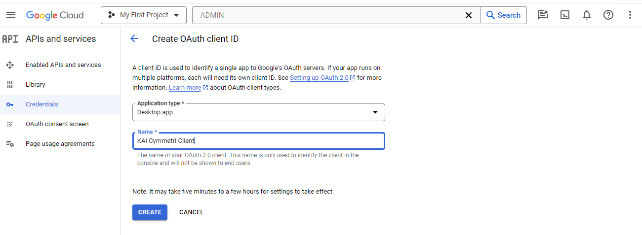 Select **Desktop app** as Application type, provide a name for the OAuth 2.0 client and then click on the **CREATE** button