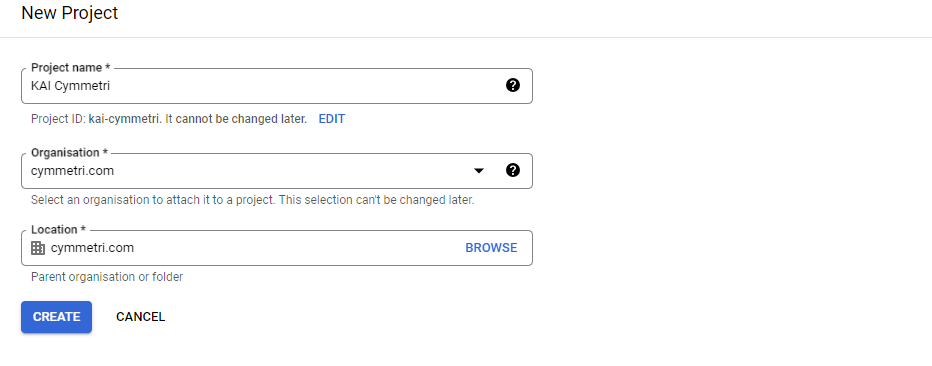 Next enter the **Project name** and select **Organisation** and **Location** as shown below and click on **CREATE** button