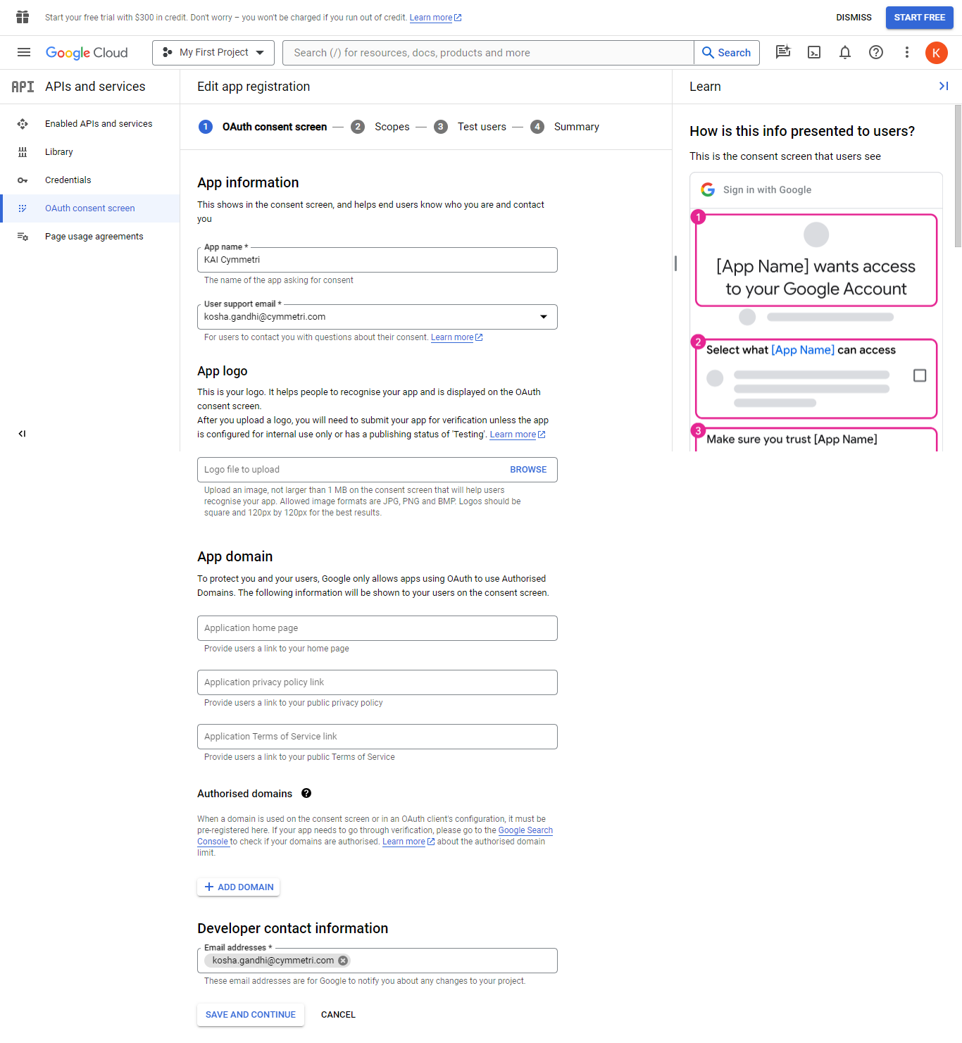 Click on OAuth consent screen and then Click on **EDIT APP.** Enter the required details and Click on **SAVE AND CONTINUE** button
