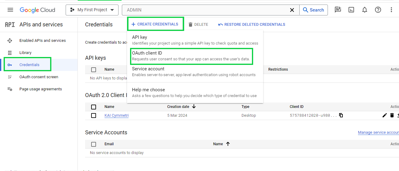 Now click on **Credentials** section and click on **CREATE CREDENTIALS** button and in that select OAuth client ID option