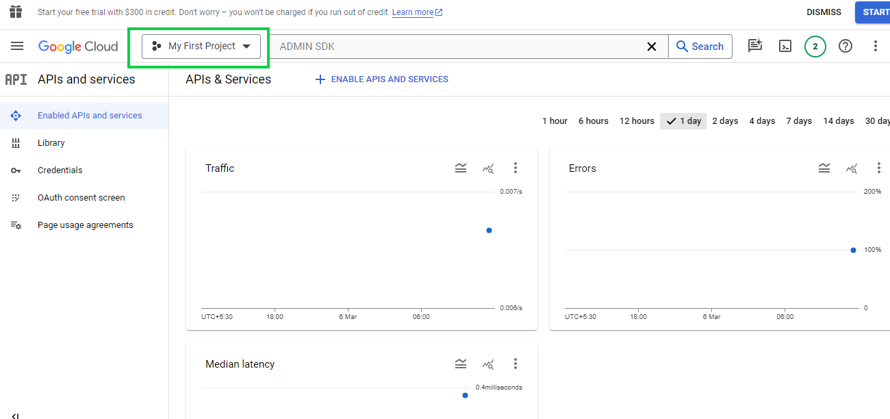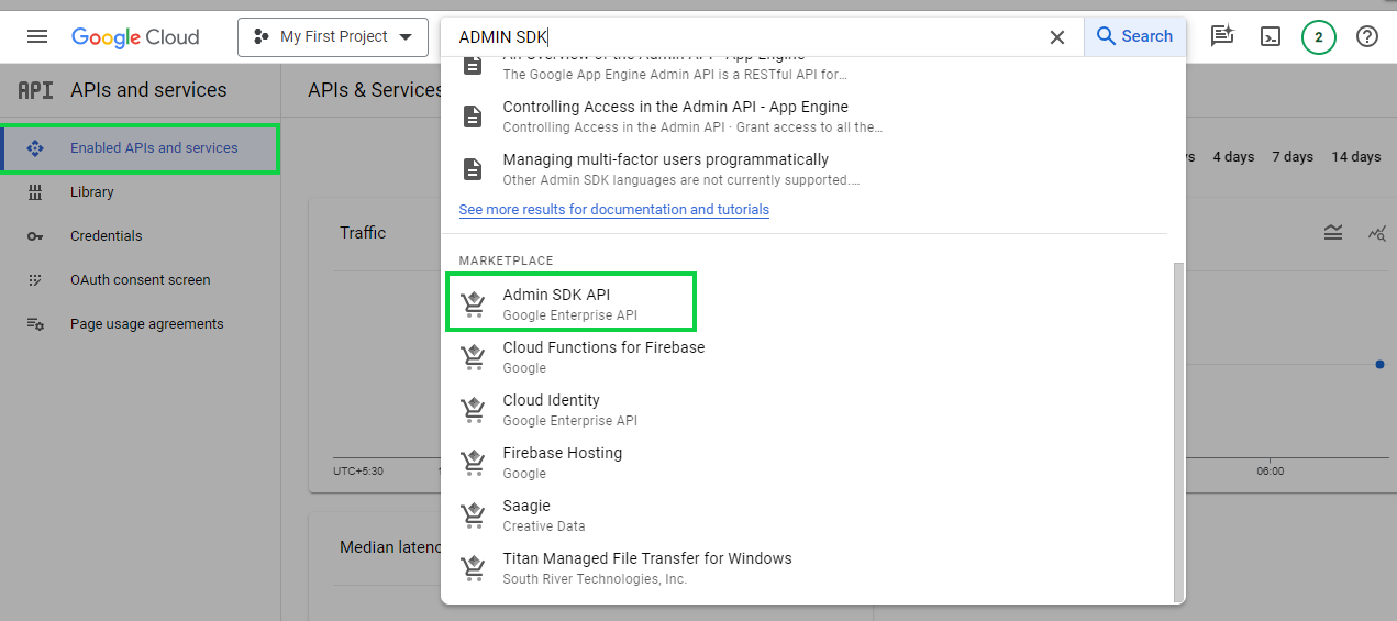 To enable ADMIN SDK API click on **Enabled API & Services** and Search for Admin SDK API: