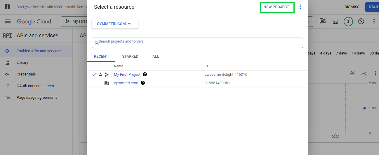 Go To <https://console.developers.google.com/> and create a new Project if not already created.  A new project needs to be created because it allows you to manage the credentials required to access Google APIs and services securely. A new project can be created by clicking on the New Project on top right or by clicking on the the Resource Dropdown&#x20;
