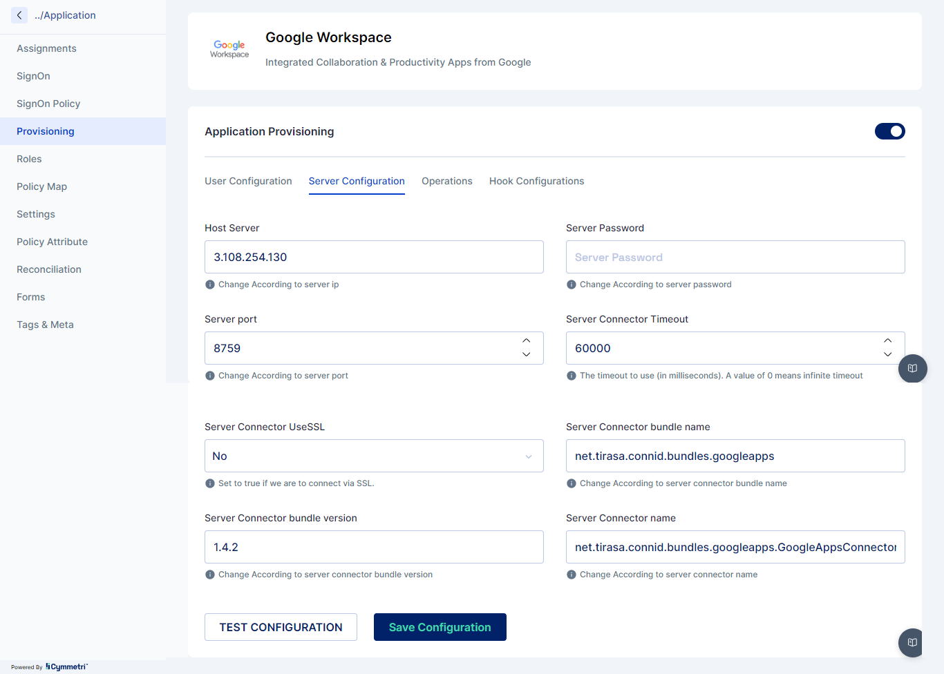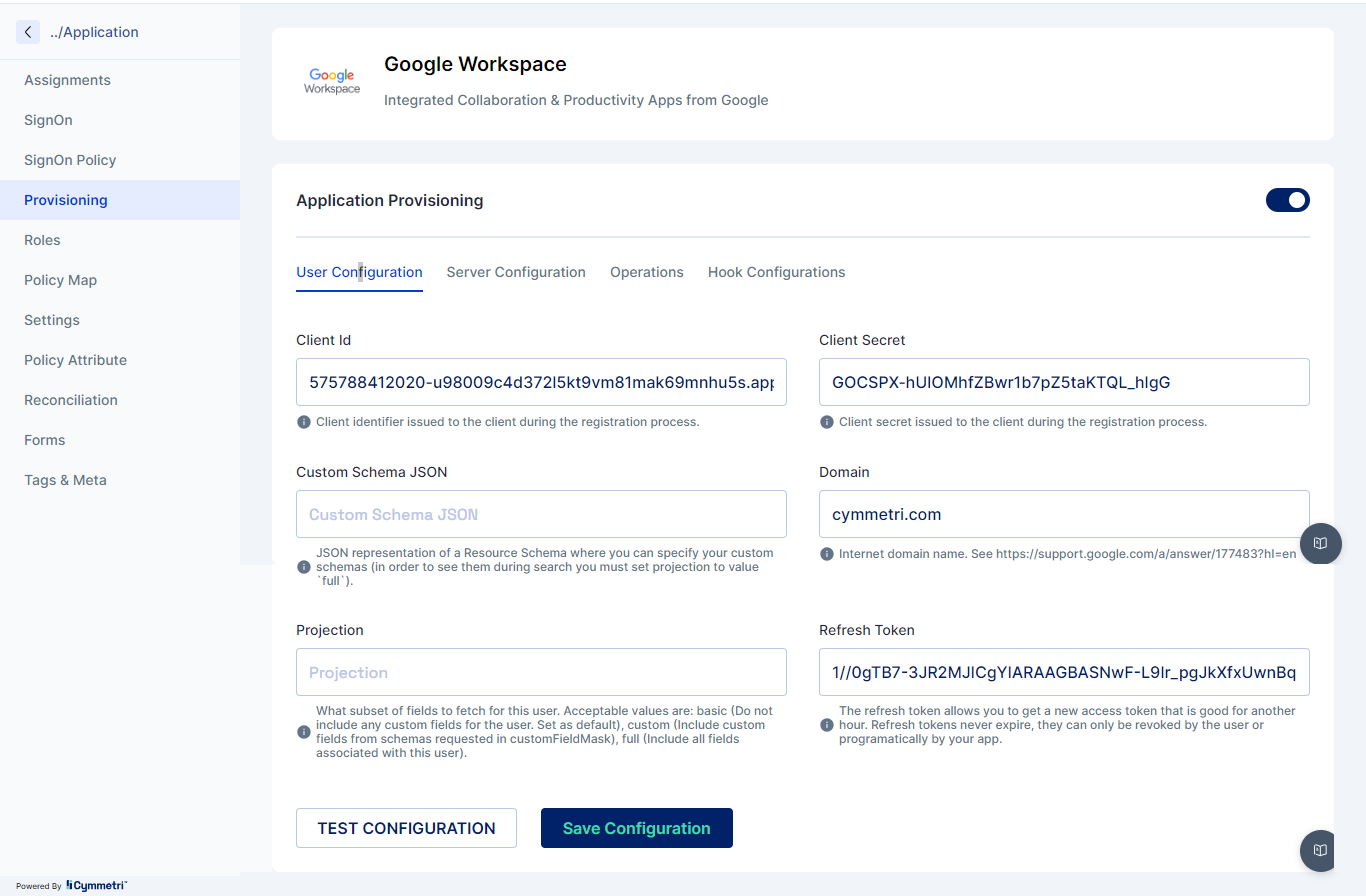 Once the above information is obtained we need to configure the Google Workspace in Cymmetri with Server Configuration and User Configuration as shown below:
