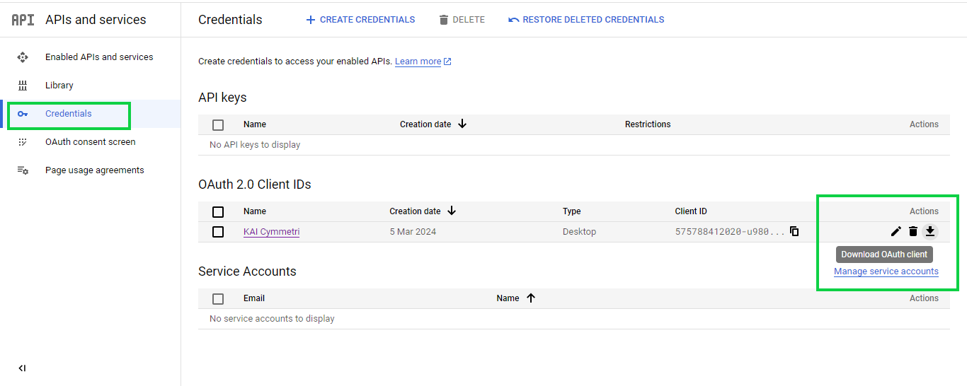 Next Click on Credentials section  and downlaod OAuth client json file on your local machine by clicking on the **Download OAuth client** button.