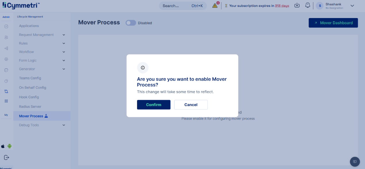 To enable Mover, click the toggle button. A confirmation prompt will appear; click "Confirm" to proceed. A pop-up message "Mover process config enabled successfully" will confirm activation.