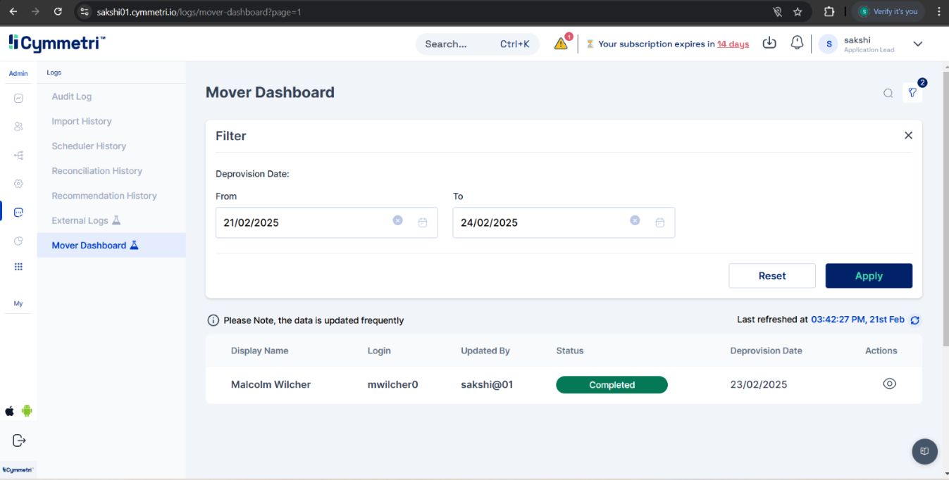In the Mover Dashboard, use the "Filter" option, select the "Start Date" and "Overlapping Date," and click "Apply" to view the status of applications scheduled for deprovisioning