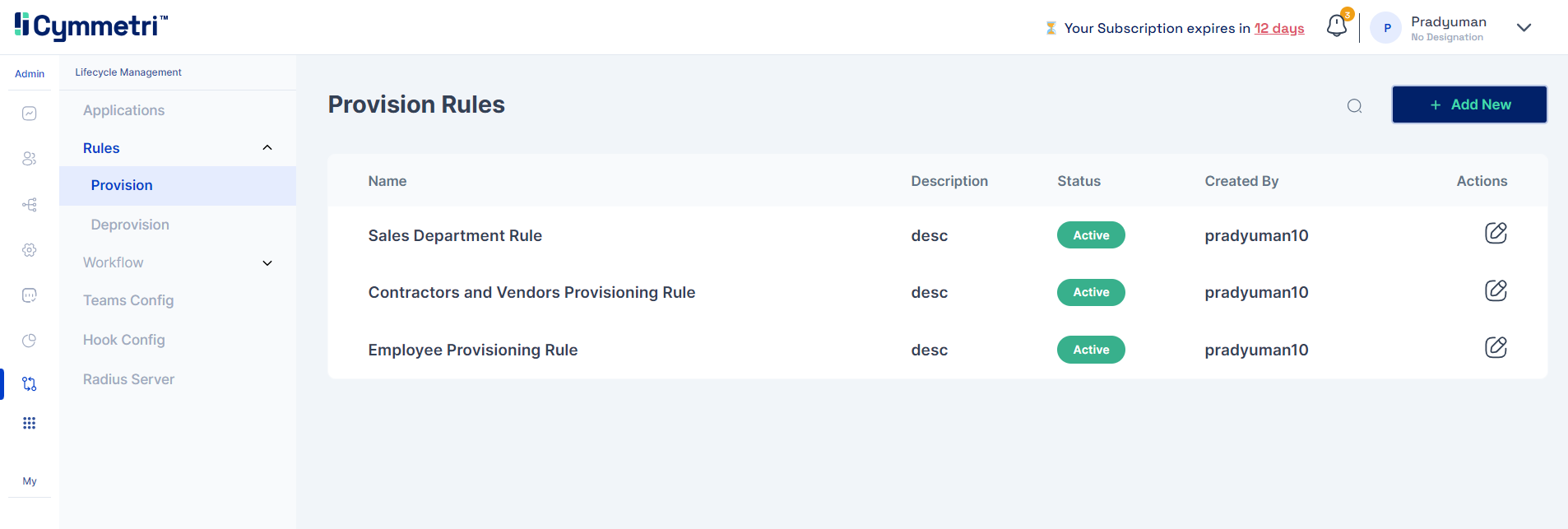 On the top right corner of the page the admin can find the Add New button to add a new provisioning rule in Cymmetri.