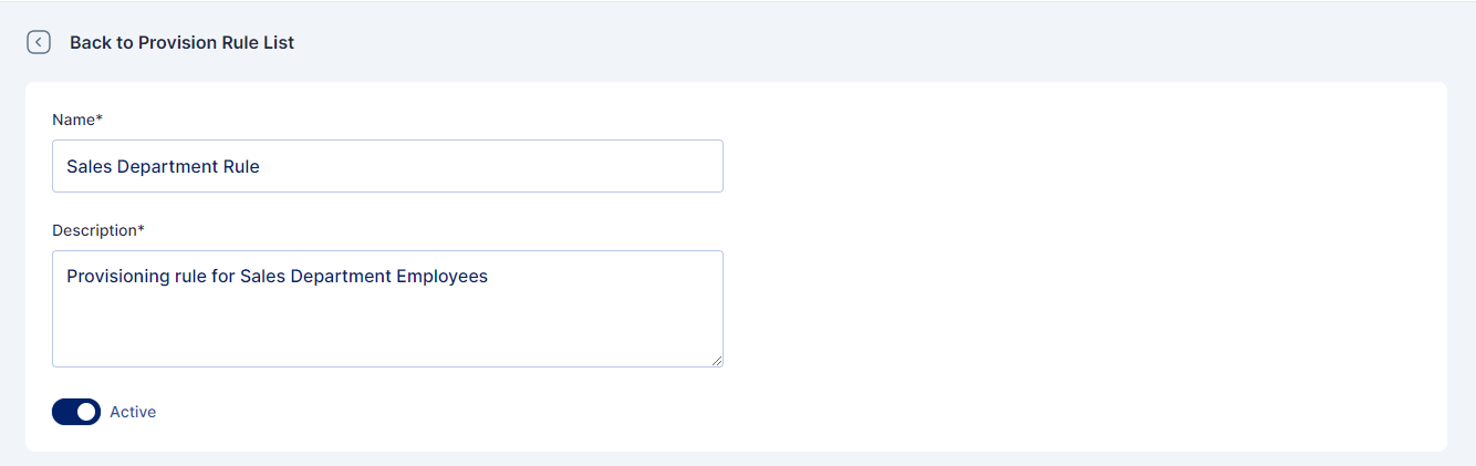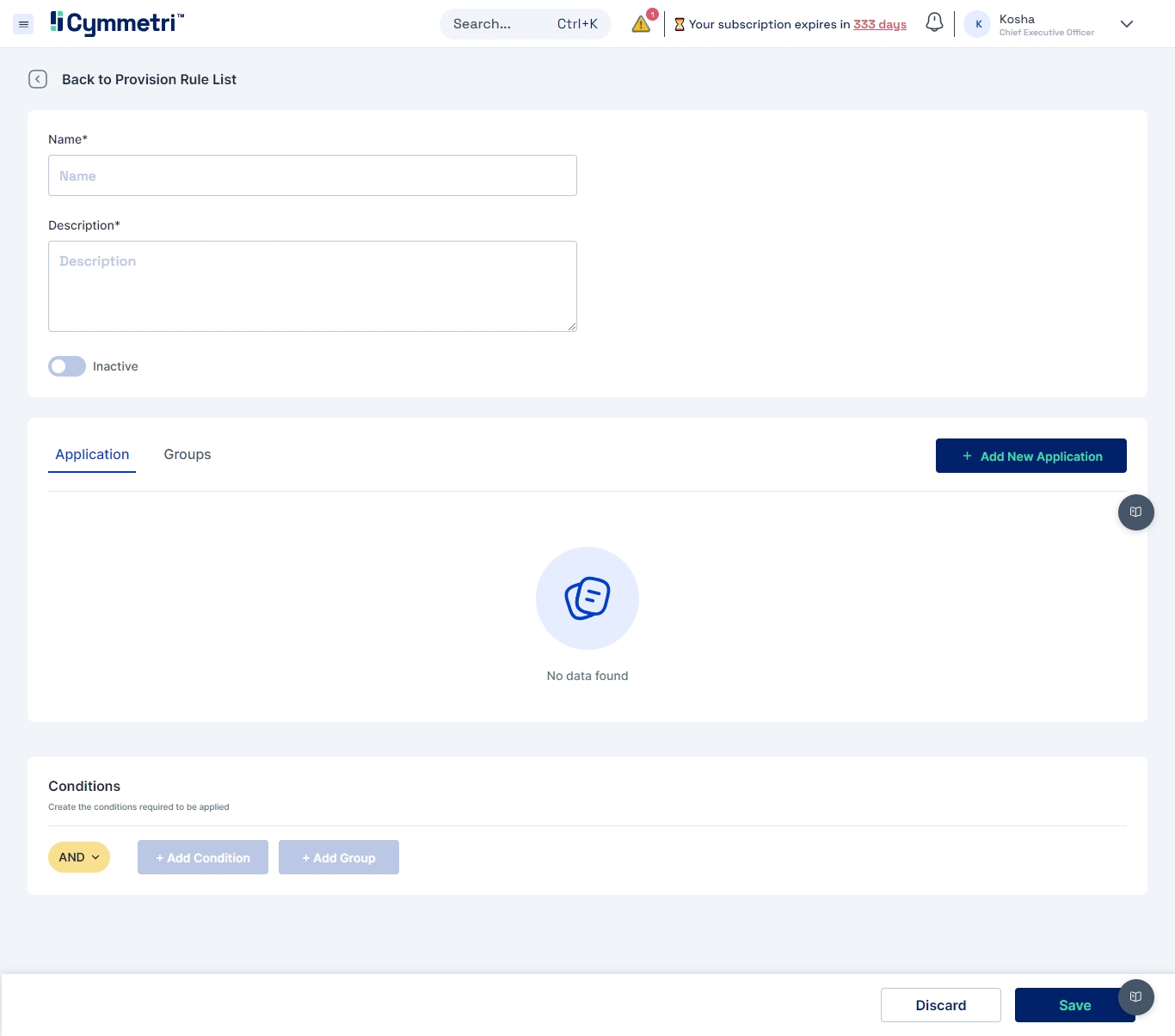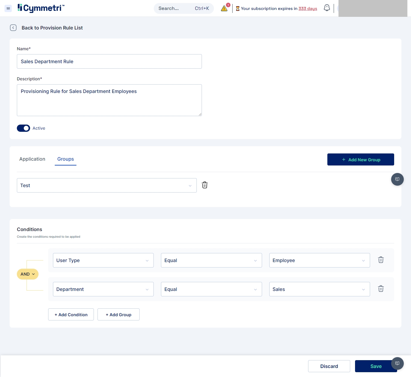 In Cymmetri, administrators have the ability to establish these rules within the "Rules" tab under the Lifecycle Management module. To do so, the administrator navigates to the "Provision" section, where the following page will be displayed.