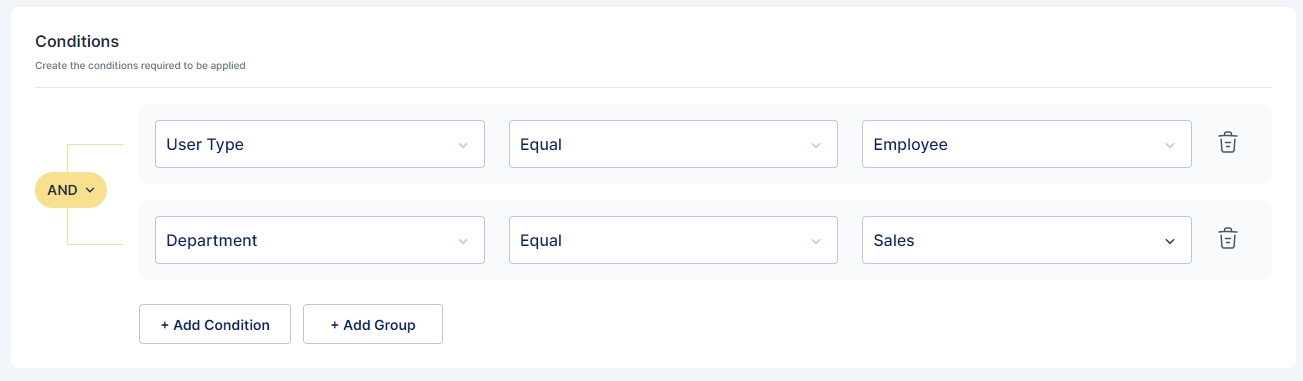 You can set up multiple conditions for the rule. For example, in the rule below, the conditions are that the user must be an "Employee," and their department should be "Sales."