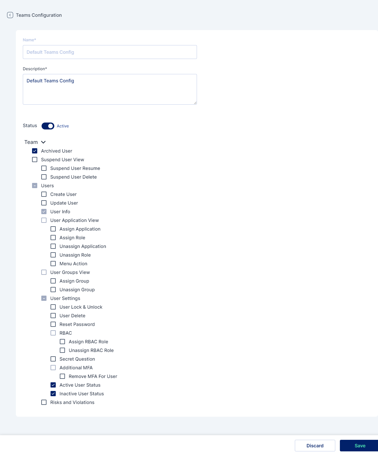 There is a **Default Teams Config** that applies to all reporting managers. Any permission enabled here is universally applicable. It cannot be deleted but can be deactivated.