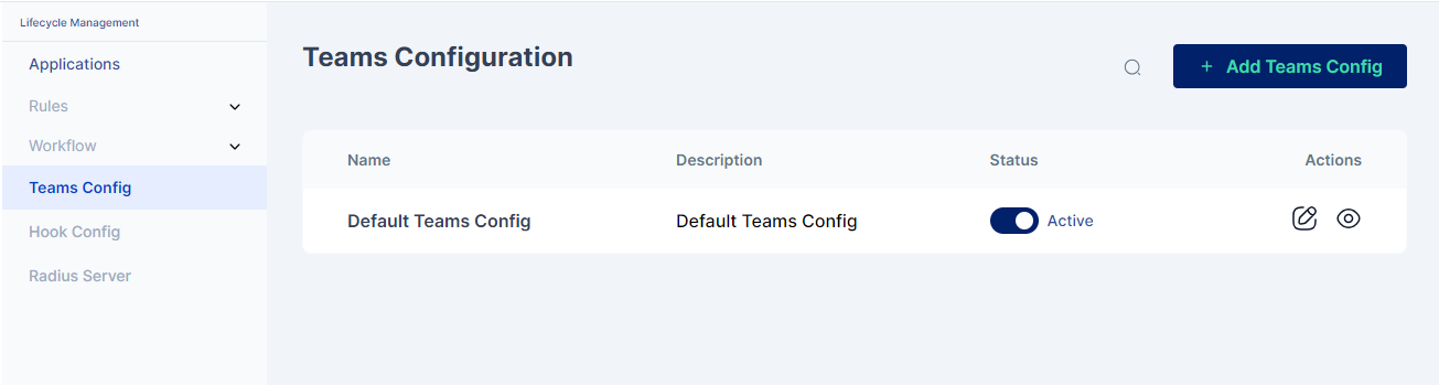 An administrator can choose to Add a new Teams config or update an existing one. A newly added configuration can be both deleted and/or deactivated.