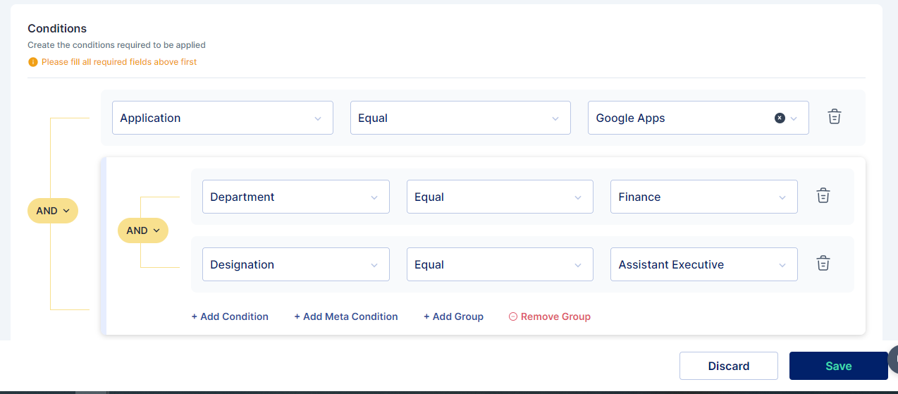 Conditions and filters can be added for country, department, designation, login pattern, user type, application, application role, and workflow depending upon the event selected