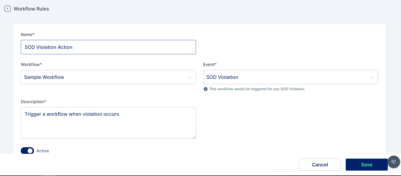 SOD Violation: This workflow would be triggered for any SOD Violation and for taking appropriate action upon the violation. The screenshot below shows a workflow configured for this case