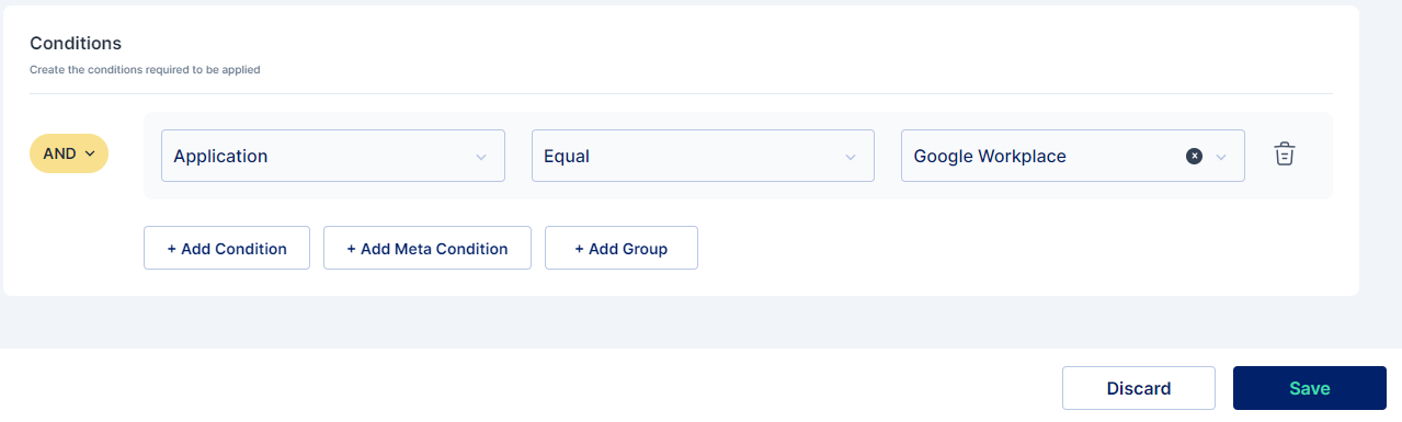 Meta conditions can be added for application events if meta values are added for applications.