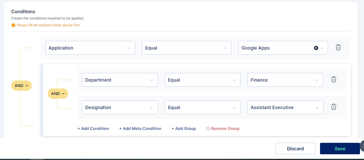 Conditions and filters can be added for country, department, designation, login pattern, user type, application, application role, and workflow depending upon the event selected