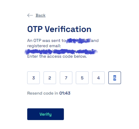 Option 2 - Choosing OTP Based PasswordlessLogin mechanism will send an OTP to the user's registered mobile number and the user is expected to enter this OTP and Click on Verify to continue.