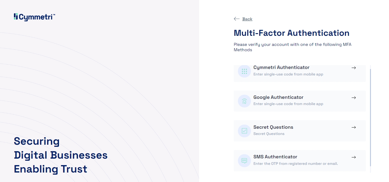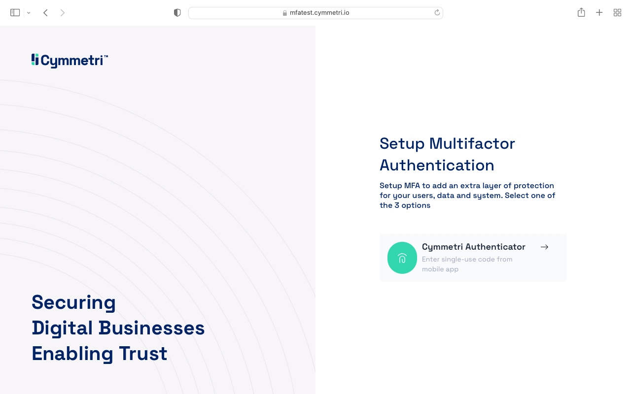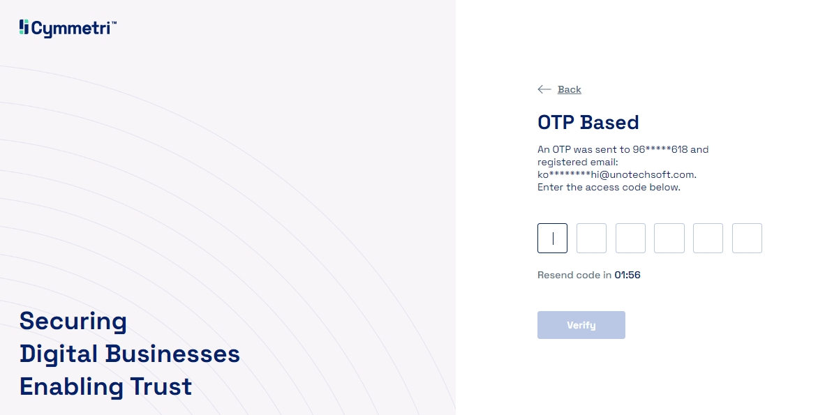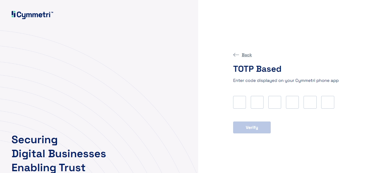 Option 1 - Choosing Cymmetri Authenticator will require the user to enter their Time-based OTP as it appears on your Cymmetri Authenticator mobile application. The user needs to enter the TOTP and click on Verify to continue.